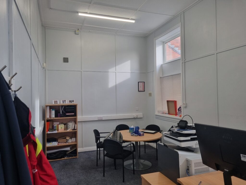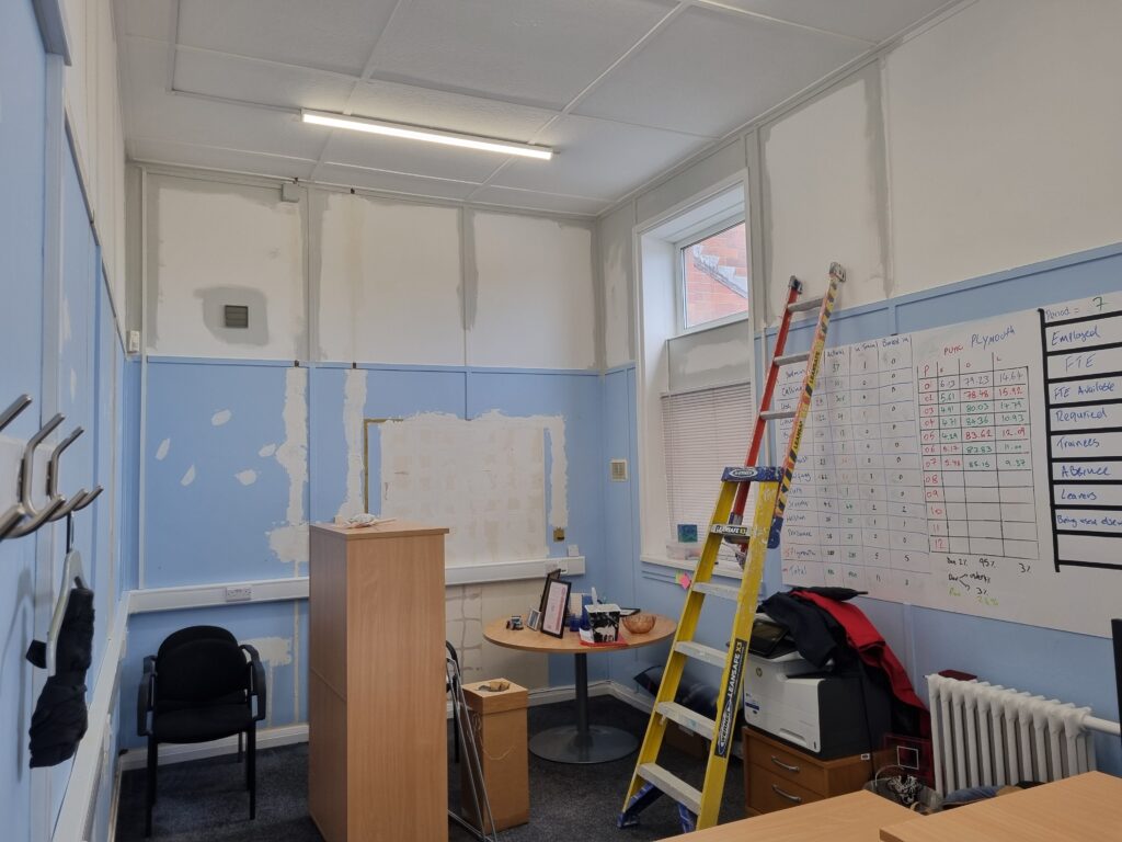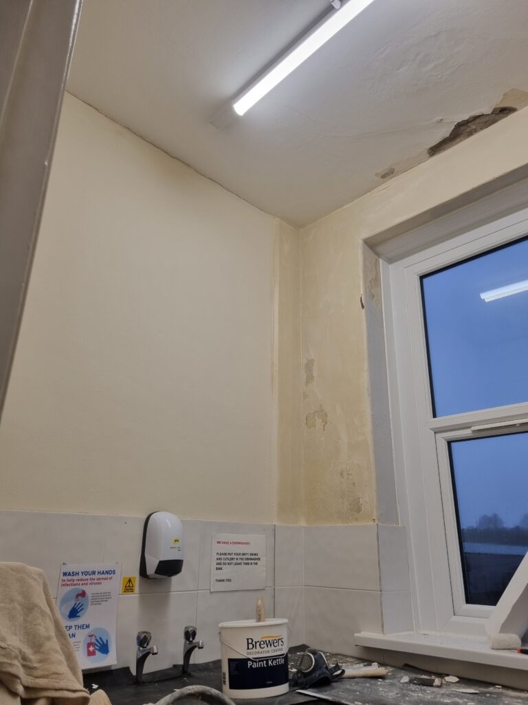 Pictured below is the before and after for the MD’s office and the Kitchen for Management which was in need of repair as you can see. Old buildings can be a challenge.