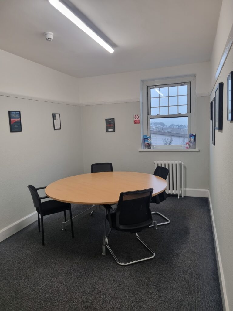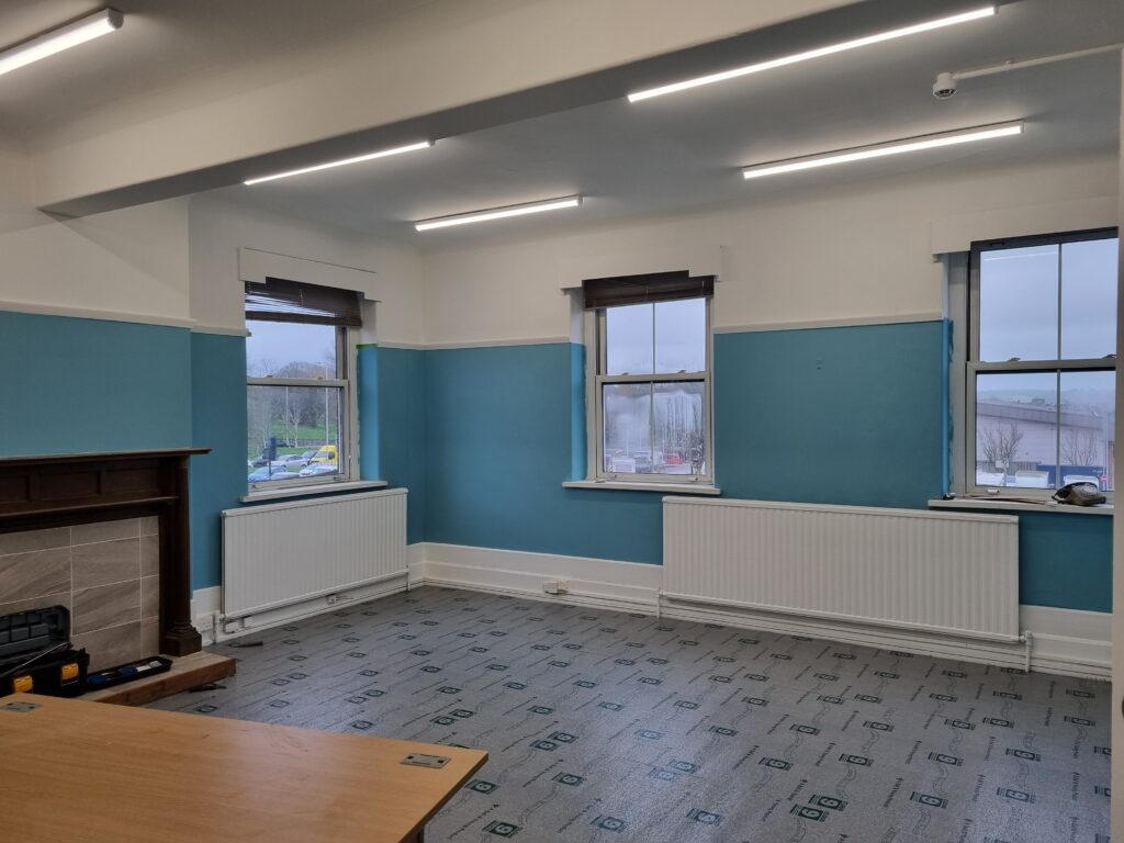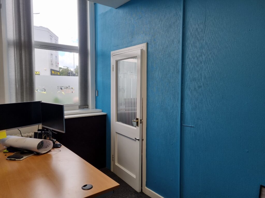 Commercial Director’s office; some of the common problems seen in a 1902 building before the smiles. Old magnolia to Pearl Grey and White. Clean and serene.